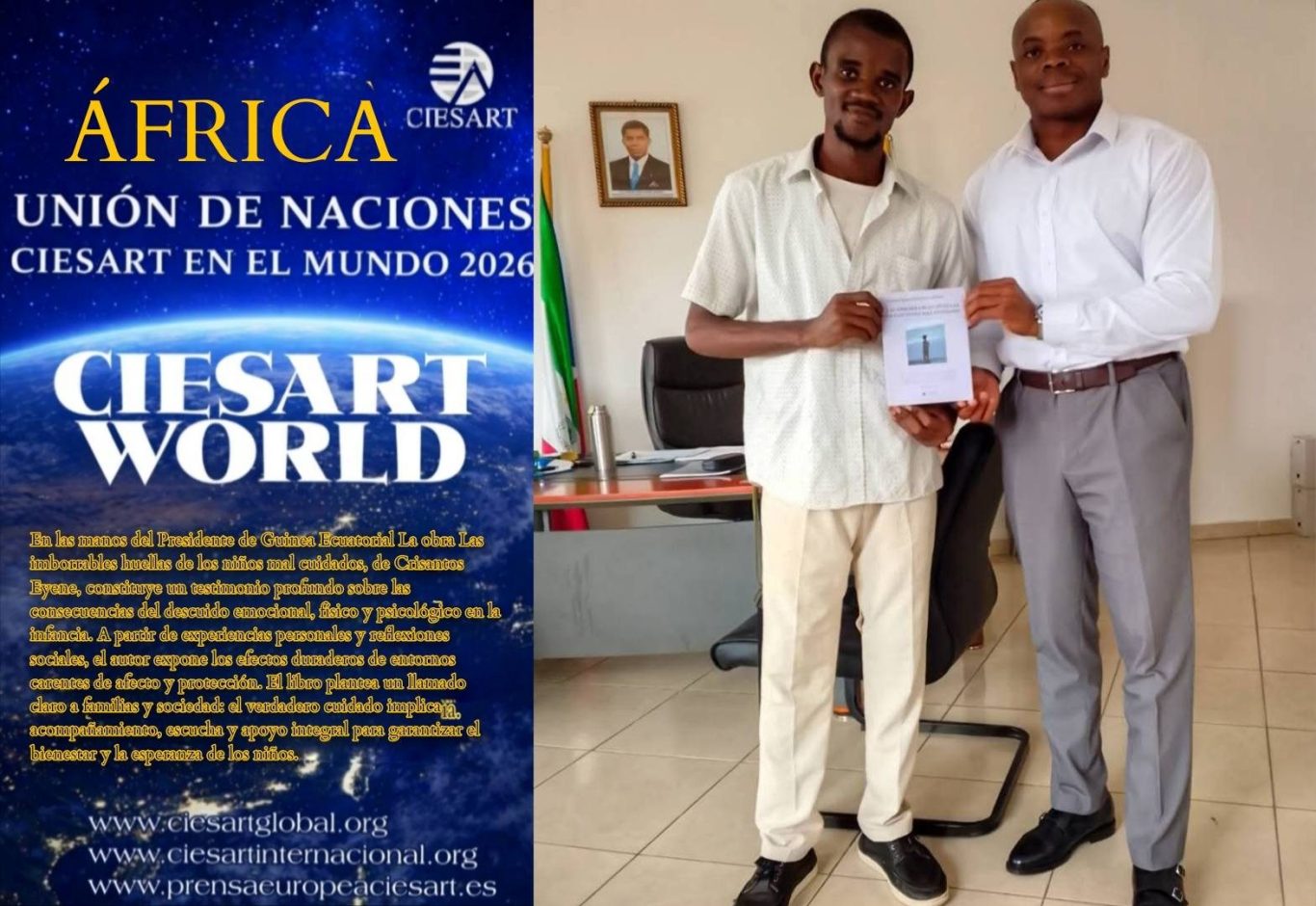 Asimismo, en un acto protocolario, el Presidente de la República de Guinea Ecuatorial recibió la obra “Las imborrables huellas de los niños mal cuidados”, del autor Crisantos Eyene. Este libro constituye un testimonio profundo sobre las consecuencias del abandono emocional, físico y psicológico en la infancia, y plantea un llamado a la responsabilidad social y familiar, destacando la importancia del acompañamiento, la escucha y la protección integral para garantizar el bienestar y la esperanza de los niños.