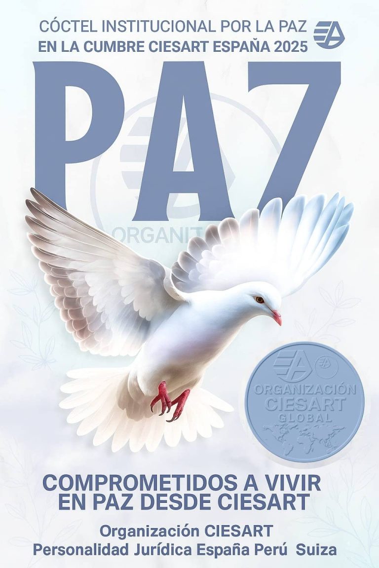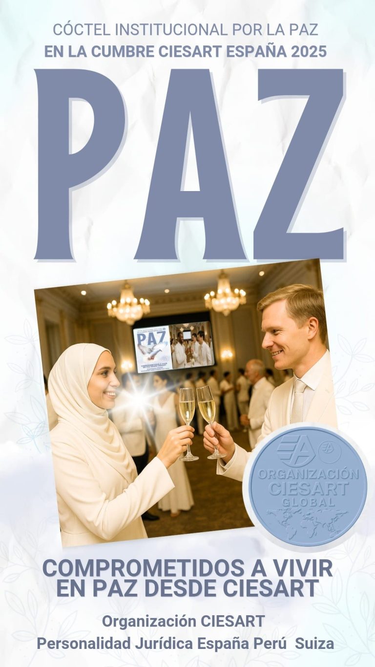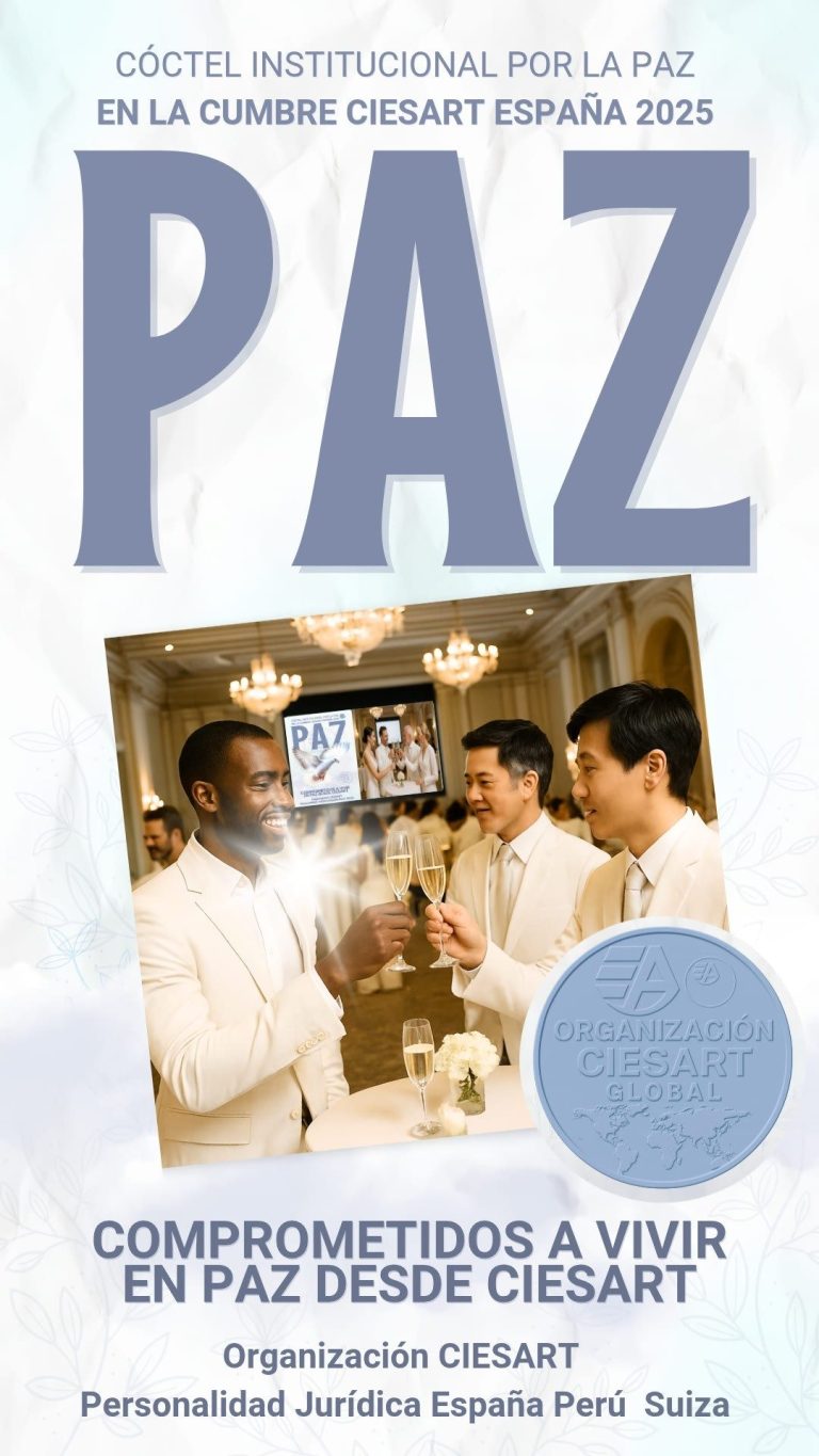 La Cámara Internacional de Escritores & Artistas CIESART, en el marco de la Cumbre CIESART Diciembre 2025, celebrará como uno de sus actos centrales el Cóctel Institucional “Comprometidos a Vivir en Paz desde CIESART”, solemne encuentro en el que los Invitados de Honor Internacionales, tras la lectura de discursos de todos los países reunidos, procederán a la firma del Libro y del Acta Institucional de la Paz, dejando constancia de su adhesión al compromiso universal de promover la concordia, la fraternidad y la dignidad humana.