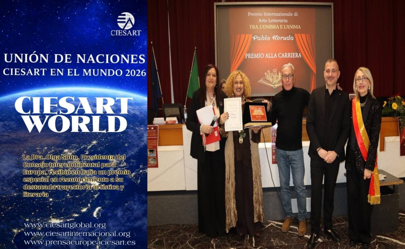 En Europa, la Presidenta Intercontinental de CIESART para Europa, Dra. Olga Sotto, participó en Italia en una destacada jornada cultural donde recibió un premio especial en reconocimiento a su trayectoria artística y literaria. El evento fue organizado en el marco de los Premios Oficiales de CIESART, presididos por la Dra. Marina Pratici.